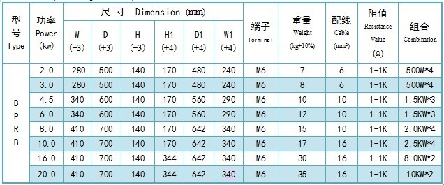 產(chǎn)品特點(diǎn)(Product Features) 1.額定功率范圍:2KW-20KW; 2.額定阻值范圍:1Ω-10KΩ 3.最大工作電壓:2KV; 4.耐壓范圍:AC3KV 50Hz/1min 5.額定溫升:375℃; 6.溫漂范圍:≤400ppm/℃ 7.IP 等級:IP00-IP23; 8.振動:1.5g 9.熱平衡時間常數(shù):1800S 10.載流體材料:0Cr25AL5