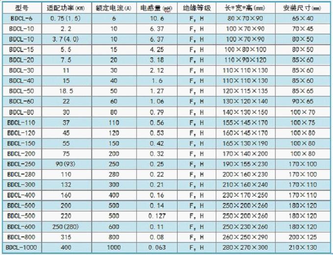 技術參數 (Technical Parameter) 1.額定工作電壓:380V/50Hz或者660V/50Hz 2.額定工作電流:3A至2000A/40℃ 3.抗電強度:鐵芯--繞組3000VAC/50Hz/5mA/10s無飛弧擊穿 4.絕緣電阻:1000VDC絕緣阻值≥100MΩ 5.電抗器噪音:小于65dB(與電抗器水平距離點1米測試) 6.防護等級:IP00 7.絕緣等級:F級以上