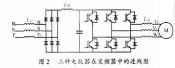 2.直流電抗器BDCL,也叫平波電抗器,一般接在變頻系統的直流整流環節與逆變環節之間,BDCL能使逆變環節運行更穩定,及改善變頻器的功率因數。 3.輸出電抗器BOCL,也叫出線電抗器。通常接在變頻器輸出端與負載(電機)之間,起到抑制變頻器噪聲的作用。三種電抗器在變頻器中的連接如圖2所示。