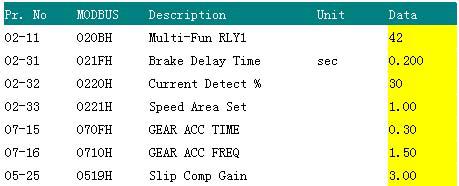 (5)調(diào)整機(jī)械抱閘控制點(diǎn): 02-11=42 (多功能輸出)02-31=0.2S延遲時(shí)間 02-32=30 (電流監(jiān)測(cè)) 02-33=1.0(速度設(shè)置) 07-15=0.3()07-16=1.5 05-25=3.0