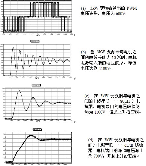 2)在變頻器的輸出端安裝dv/dt濾波器:這個(gè)措施適用于電纜長度小于300米的場(chǎng)合,價(jià)格略高于電抗器,但是效果有了明顯的改善,如圖6(d)所示。